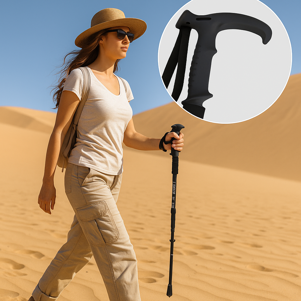 🌿 Empunhadura anatômica em EVA antiderrapante garante firmeza e conforto, mesmo em uso prolongado. O Bastão de Caminhada Pro cuida de você a cada passo!
