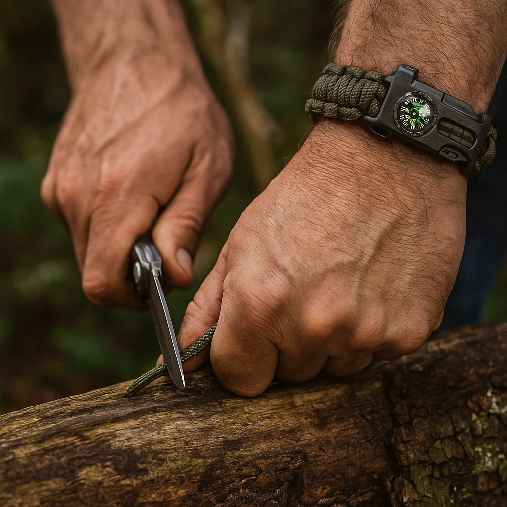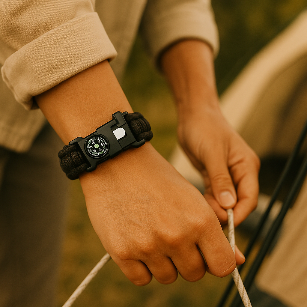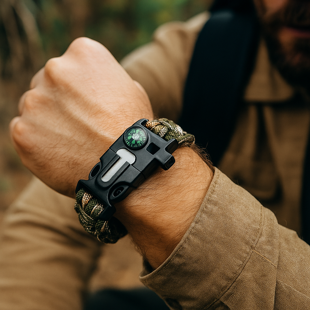 Com a Pulseira Tática 7 em 1, você carrega no braço tudo que precisa em uma emergência: fogo, direção, corte, sinalização e suporte.