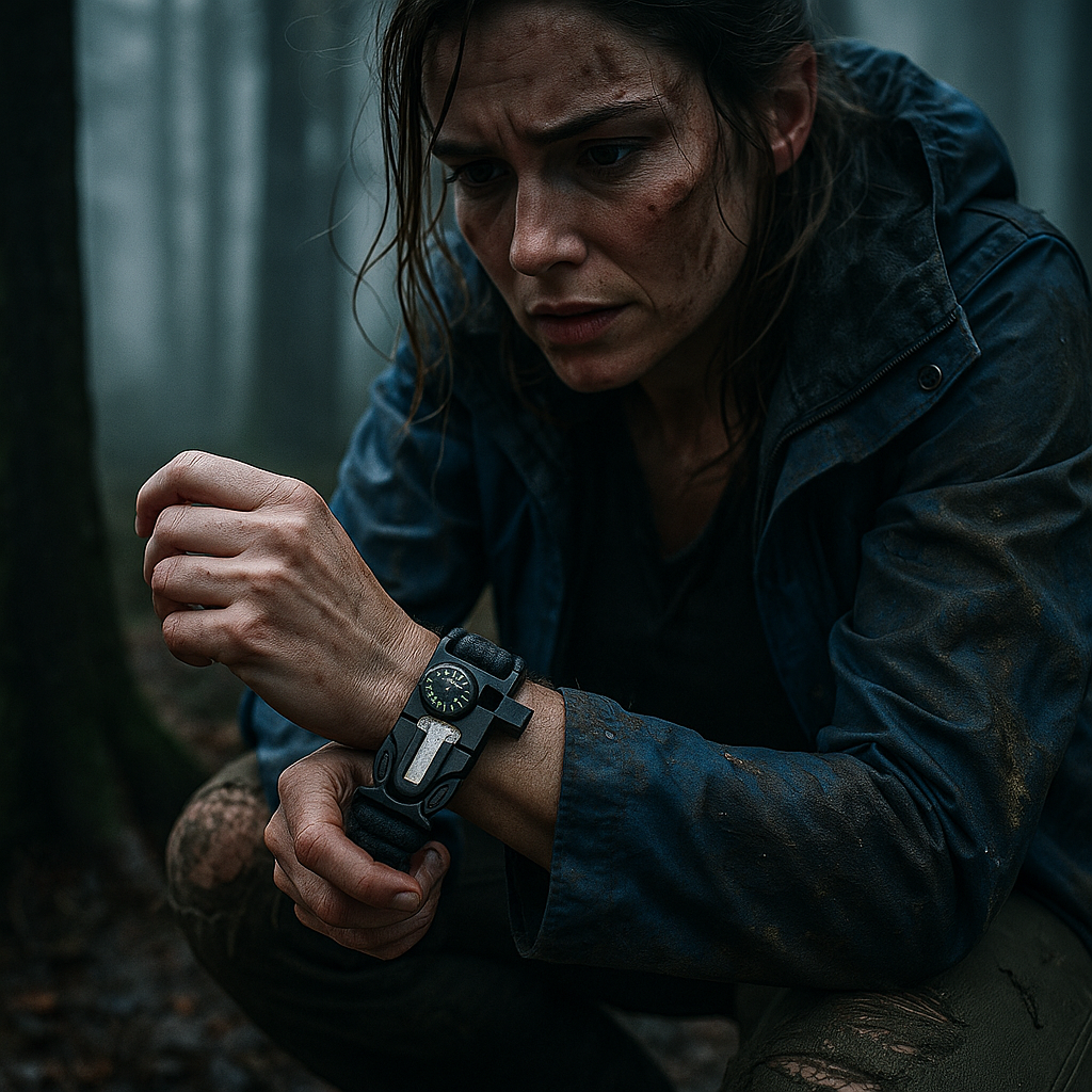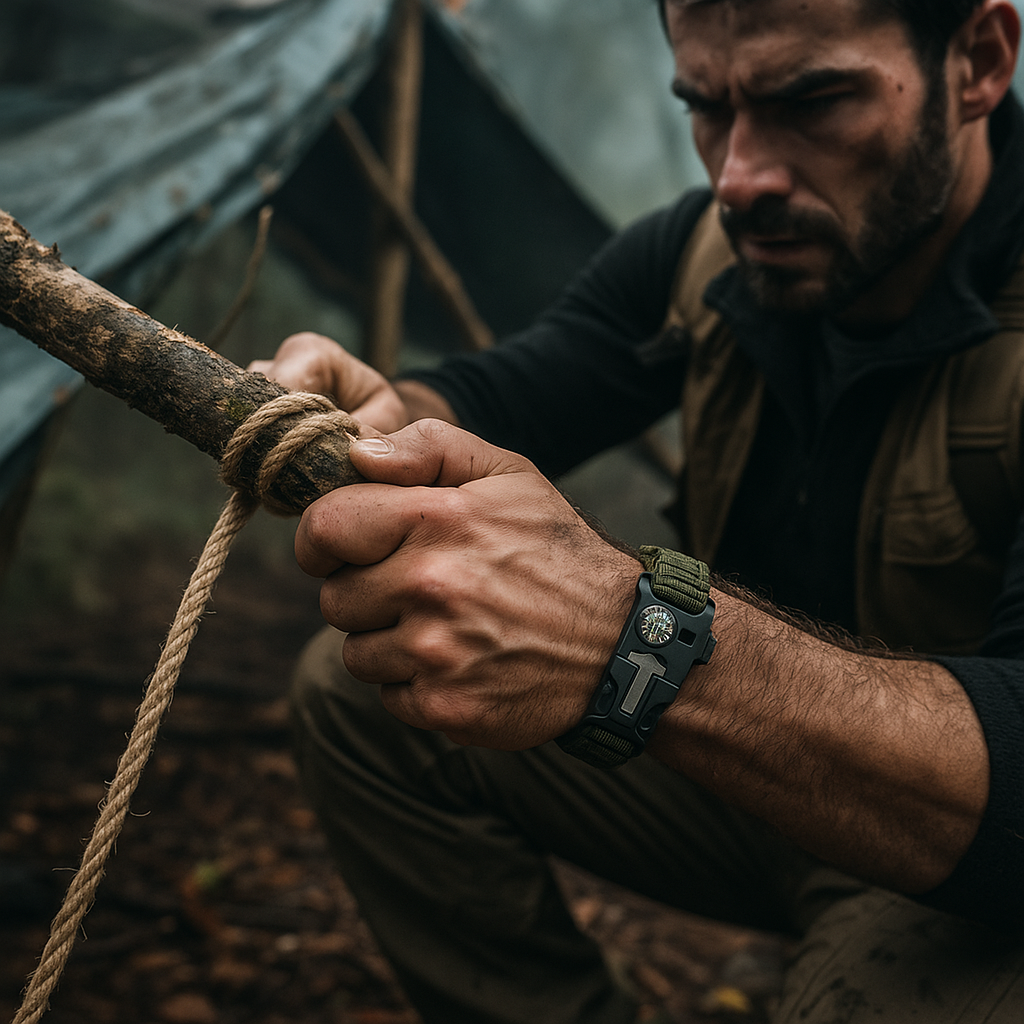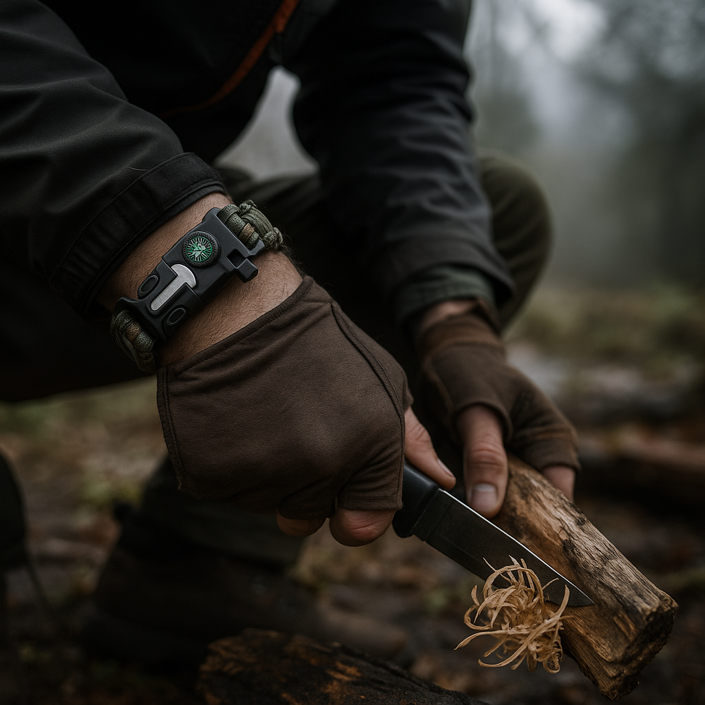 Com a Pulseira Tática 7 em 1, você carrega no braço tudo que precisa em uma emergência: fogo, direção, corte, sinalização e suporte.